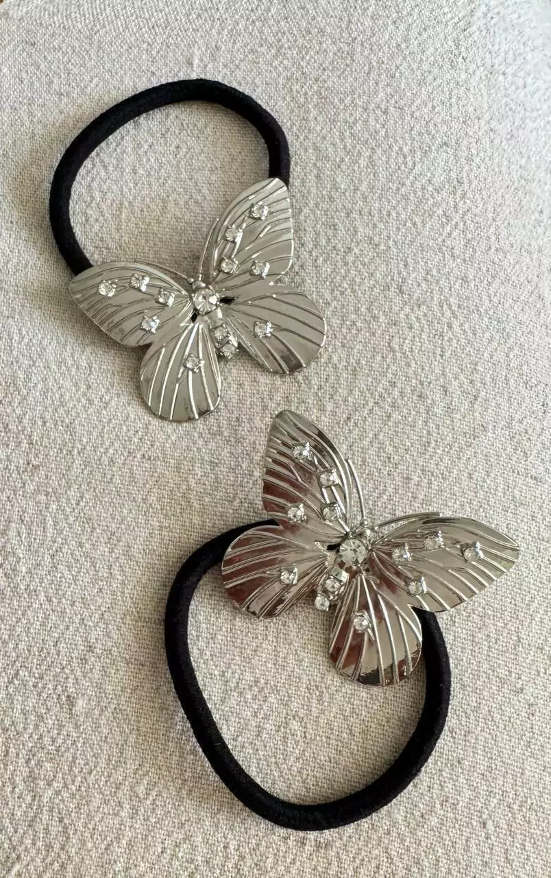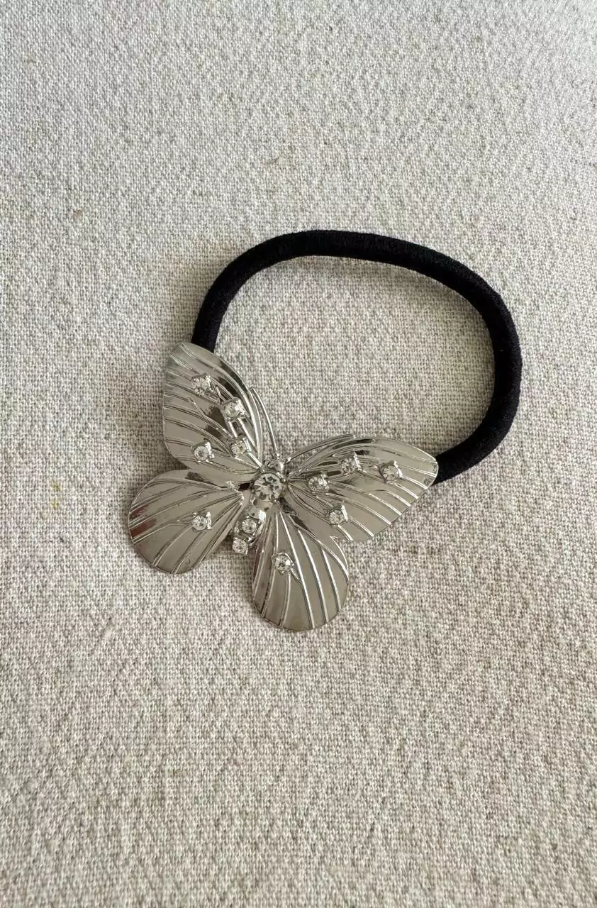 Ele é feito com uma liguinha preta bem firme com uma borboleta de metal de asinhas cravejadas.