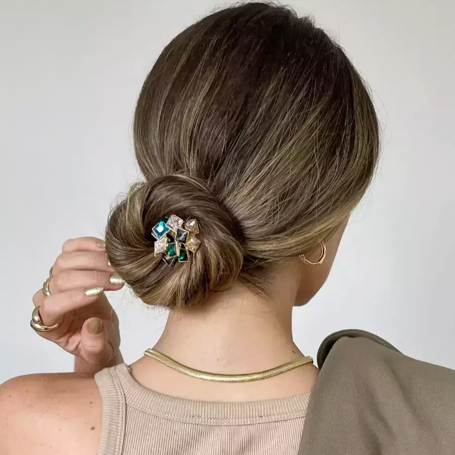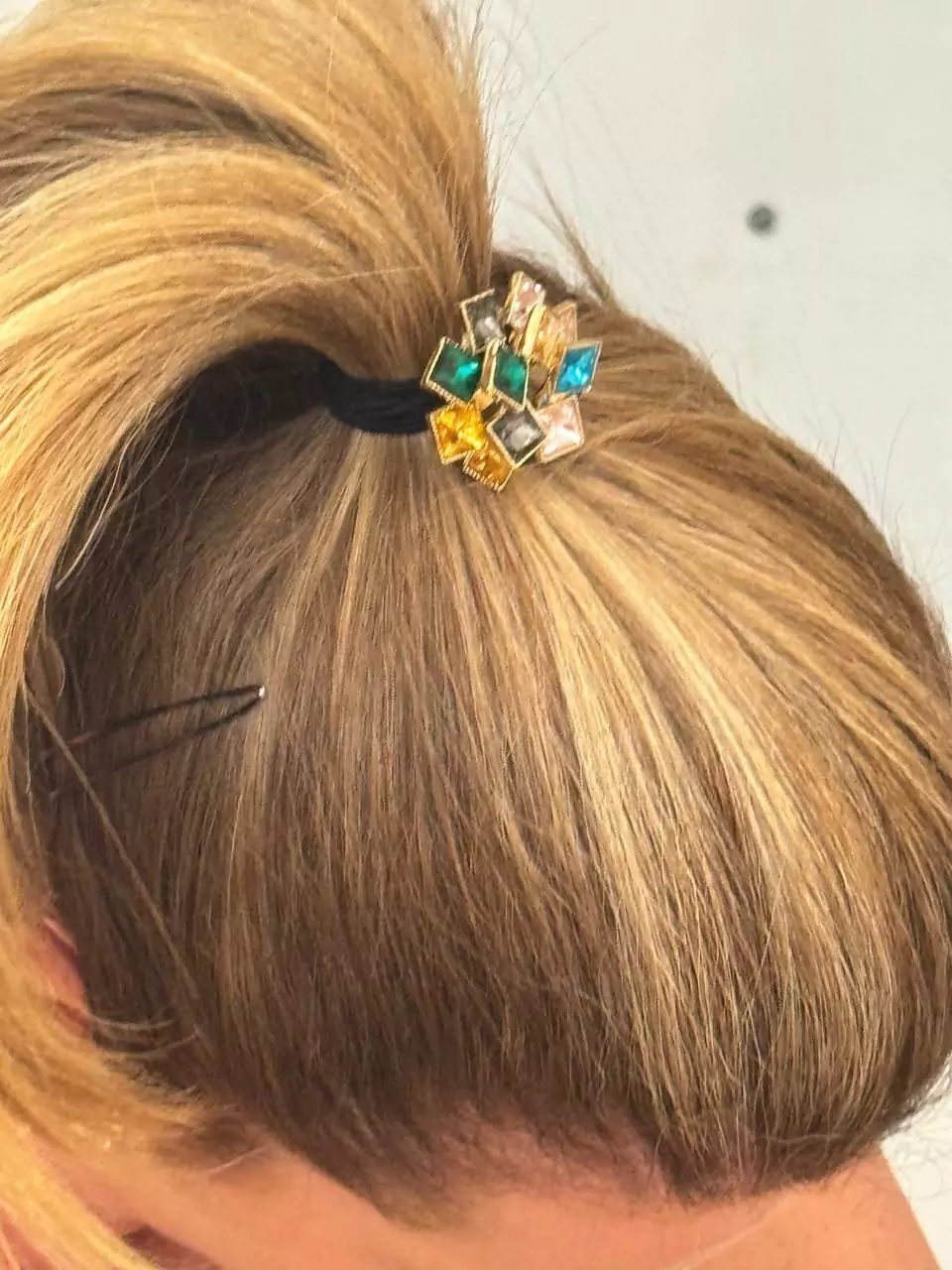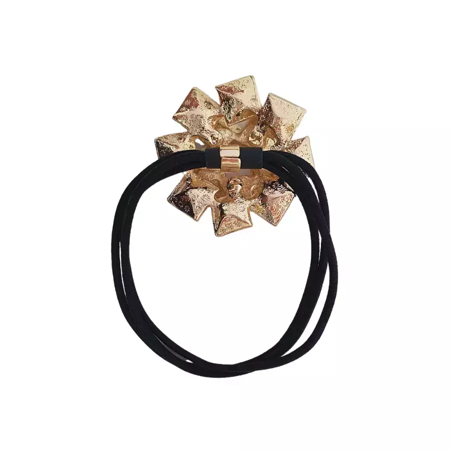 Esse elástico é formado por 13 peças de cristais soldadas umas às outras para dar forma ao acessório. A parte de prender é feita com um trio de elásticos bem resistentes.