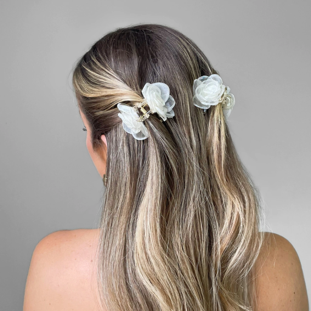 Uma das estrelas da nossa coleção, a piranha de cabelo que enfeita seu penteado em apenas 2 segundos! Com delicadas flores de organza em ambos os lados, ela não só embelleza como também oculta a piranha, garantindo um visual impecável.
